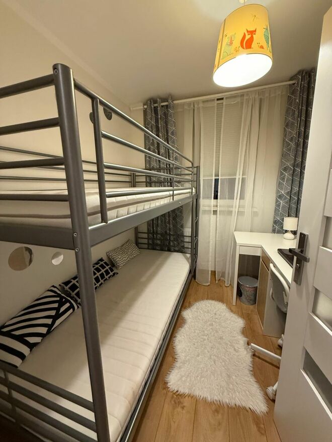 Drugi pokój urządzony jako pokój dziecięcy z łóżkiem piętrowym IKEA SVÄRTA, biurkiem i regałem — do aranżacji według potrzeb.