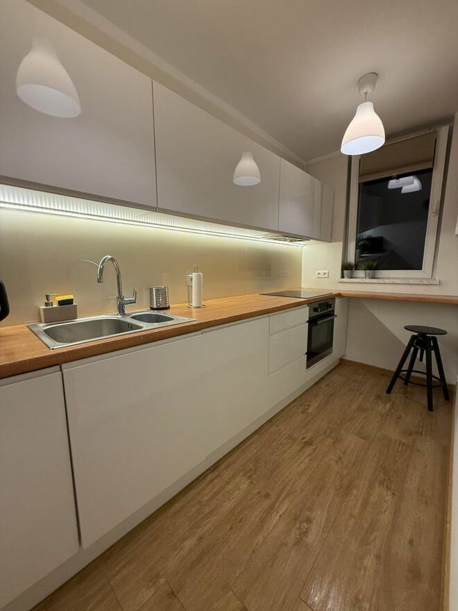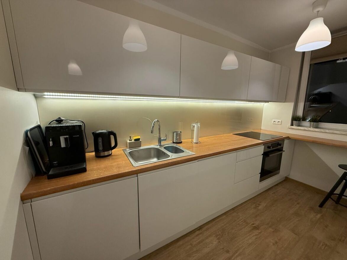 Kuchnia w kształcie litery L, to przykład przemyślanej zabudowy: białe fronty bez uchwytów w połysku, drewniany blat, podświetlenie LED, płyta indukcyjna, zmywarka, lodówka, piekarnik wbudowany i dwukomorowy zlewozmywak. Do dyspozycji najemcy: ekspres do kawy Philips i czajnik elektryczny.