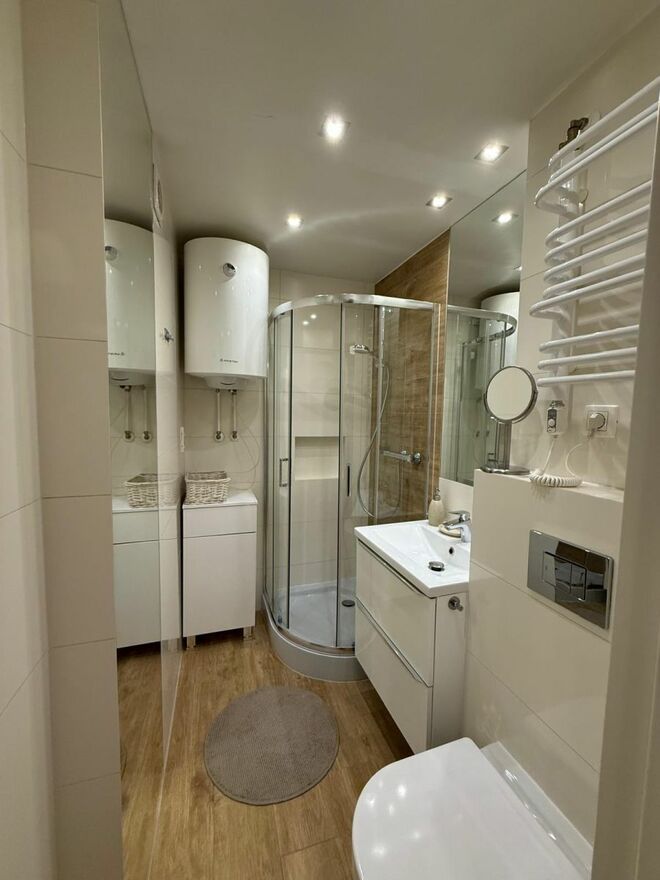 Łazienka urządzona nowocześnie — kabina prysznicowa półokrągła, umywalka podwieszana, muszla klozetowa wisząca, ogrzewacz do ręczników i pojemnościowy bojler Ariston.